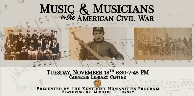 Professor Turney will discuss music written about the actual events and battles of the Civil War, as well as popular tunes about other topics that were played, sung, and danced to during the Civil War era. Included are many of the most well-known tunes written by Stephen Foster. In addition, Turney will explain how music played by military bands often gave directions to troops and helped them keep in step as they marched.
