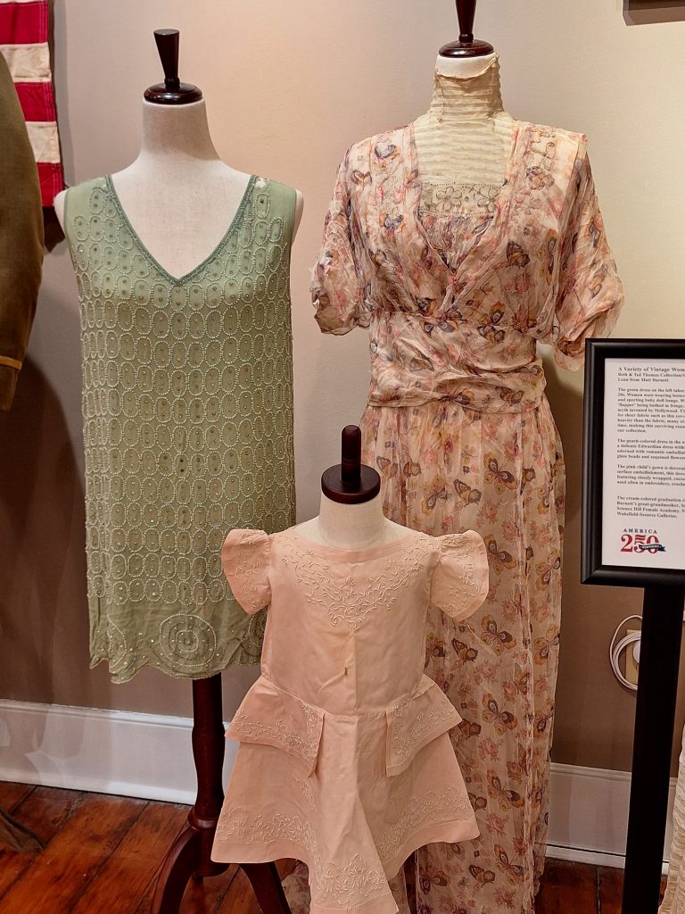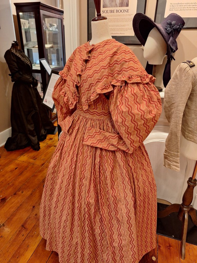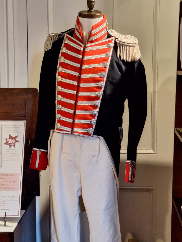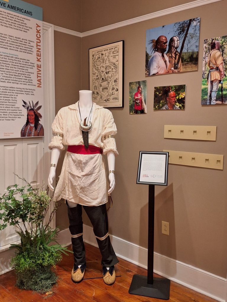 We decided to go all out and celebrate Shelby County in a BIG way for our latest exhibit. 250 Years of Clothing in Shelby County, Kentucky depicts clothing from the Eastern Woodland Native tribes in our area and settlement period to the current decade. We have a rich history, one we want to share with everyone – it not only tells the story of Shelby County and its people, but the story of Kentucky and the nation as well. Many of our members have donated clothing to our collection over the years and we saw this as the perfect opportunity to showcase these items. We currently have on display items from the Beth & Ted Thomas Collection and the Latisha Hays Collection.