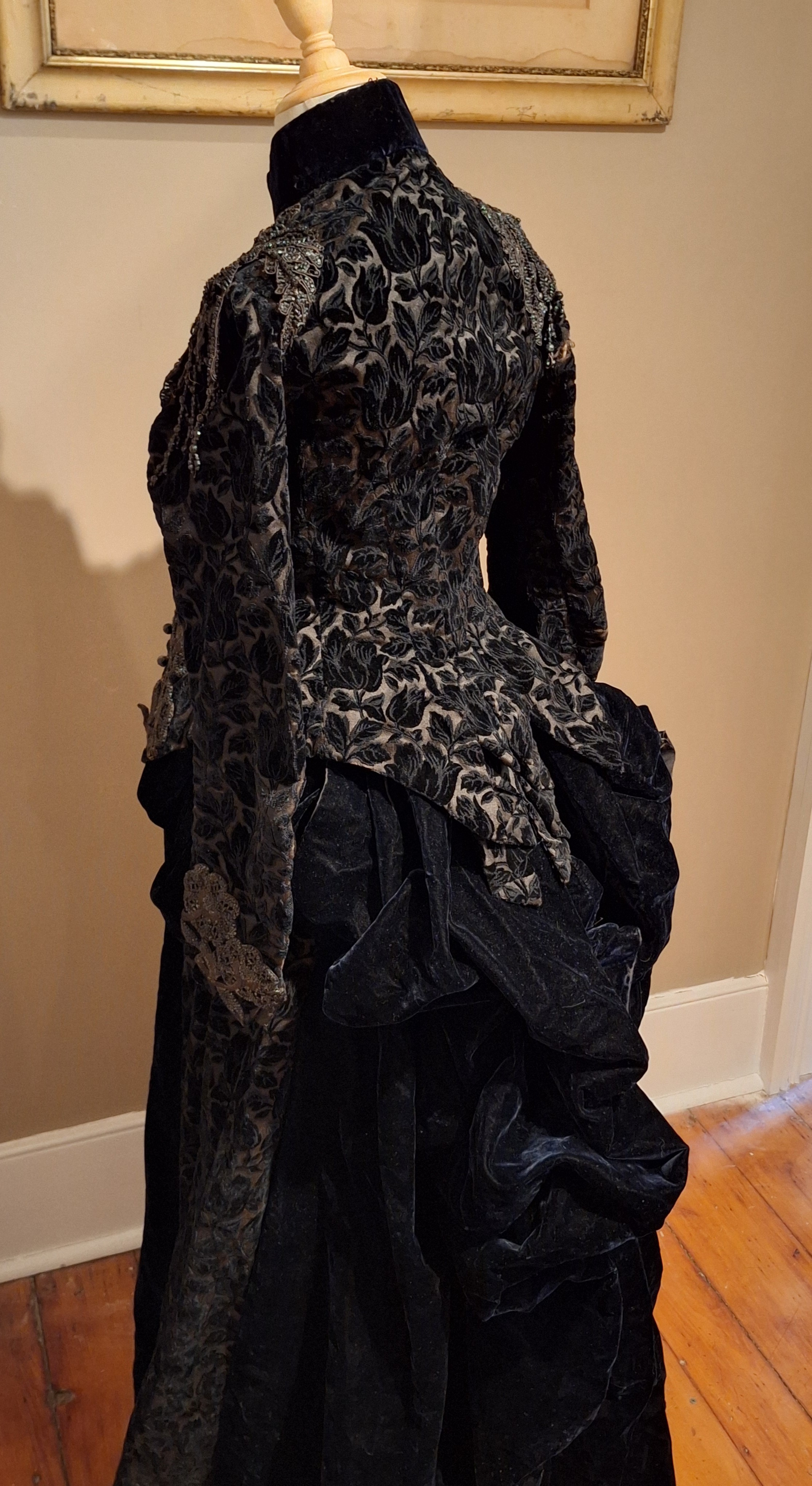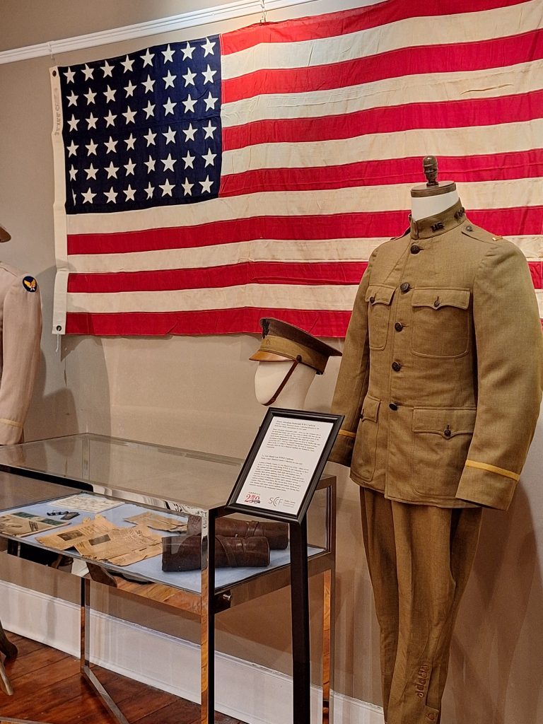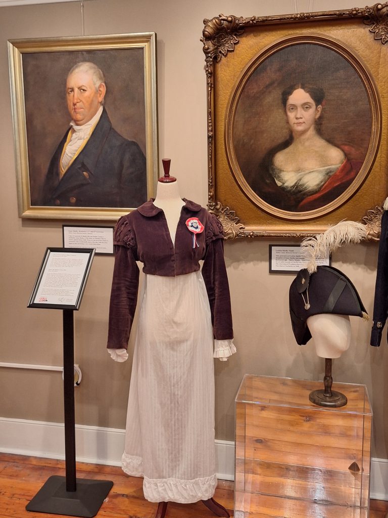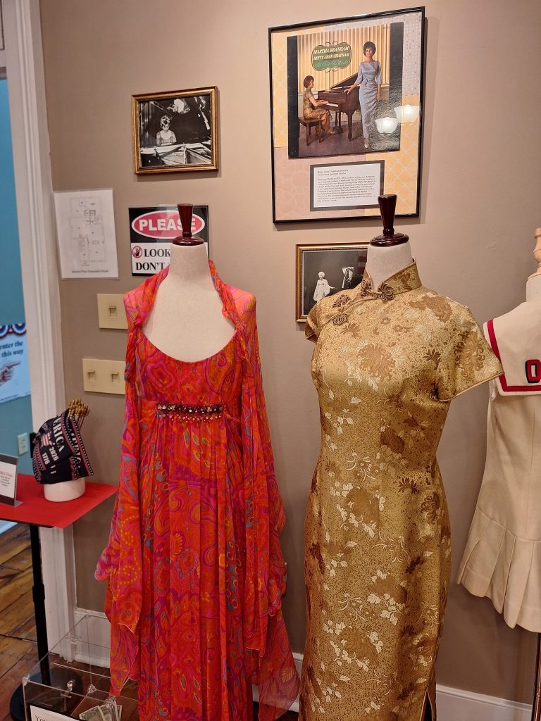 We have many incredible loaned items as well. Our Museum Committee Chair, Brian Cushing, and his wife, Amy Liebert (Textile Consultant), have lent an assortment of clothing and accessories to provide a timeline exhibit of how our ancestors dressed. Some of the items from their personal collection are a Roller Print Dress (1836) and straw bonnet from the 1830s and Wool Day Dress (1844). Both reproductions were hand-stitched by Liebert. Also on loan from them is a Men’s Suit from the 1860s/1870s. These items are originals; the shirt and trousers belonged to Corporal James V. Hicks (1836-1903). On display are military uniforms hand-made by Steve Abolt, a tailor with 40+ years of experience. Visitors to the museum will see Abolt’s replica uniforms from the War of 1812, an 1847 Officer’s Frock Coat, and Santa Anna’s uniform. Camp Nelson National Monument has loaned a reproduction uniform depicting the 5th US Colored Cavalry involved in the 1865 Simpsonville Massacre. SCHS member Sarahbeth Farabee loaned dresses her mother, Betty Jean Chatham, a concert pianist, wore while on tour oversees.