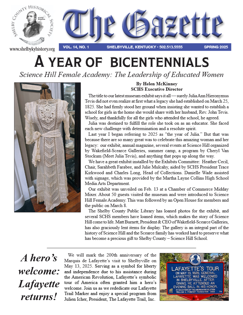 A membership to the Shelby County Historical Society is $25 per year. You are helping to support our mission to “preserve and promote the knowledge and appreciation of Shelby County and Kentucky history.”